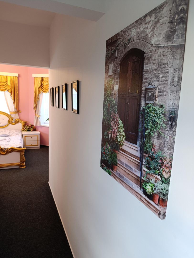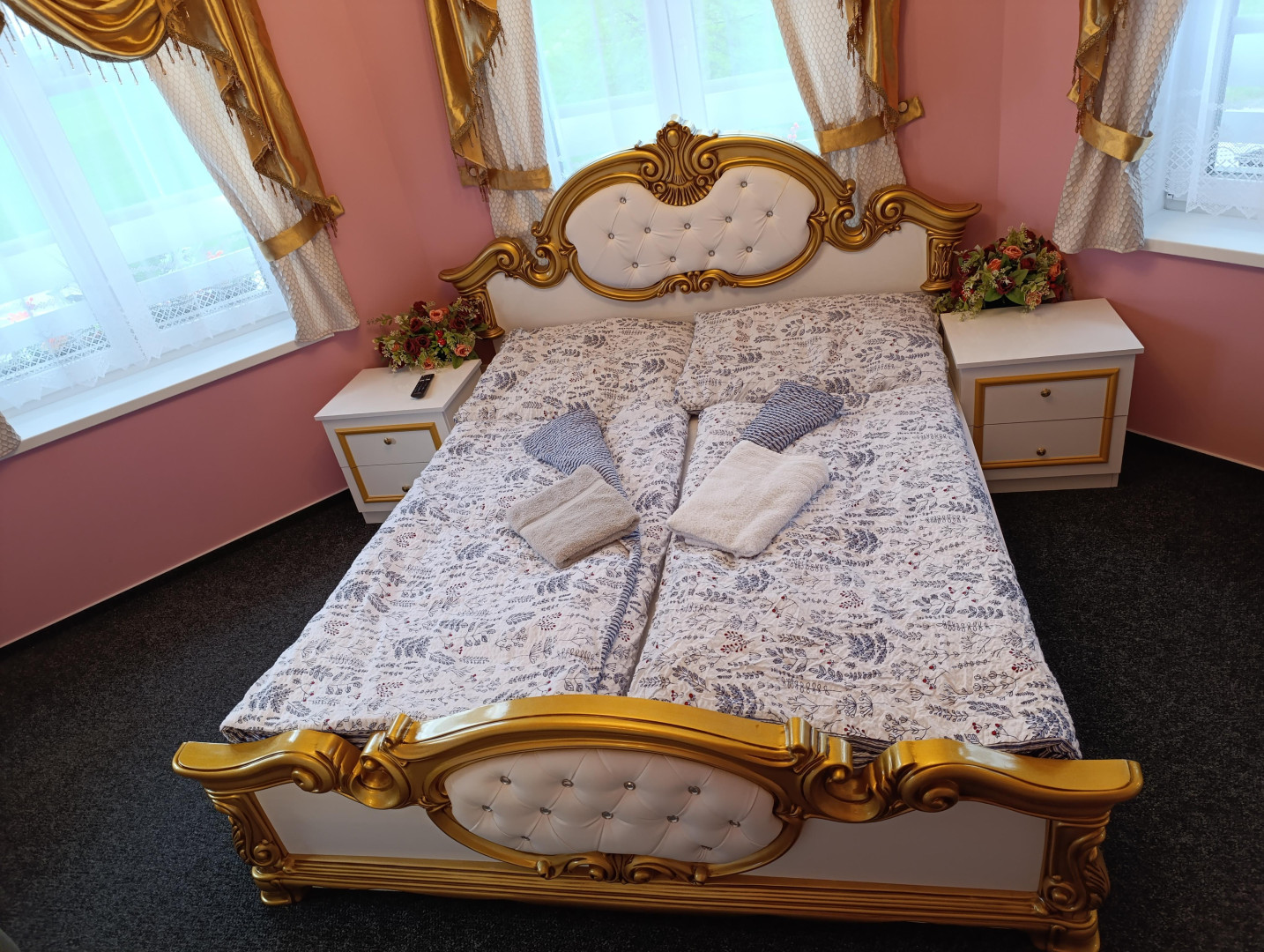 Uprostřed pokoje číslo je stylové dvoulůžko. Pokoj je dominantou celého penzionu, protože svým tvarem šestihranu poutá pozornost jak pohledem uvnitř, tak pohledem venkovním. Partnerské dvoulůžko má kolem sebe dokola čtyři okna, která zaručují dostatečný výhled a prosluněnost pokoje. Je to jediný pokoj , který nemá sprchový kout, ale vanu a to osvětlenou. Tento pokoj je nejvíce romanticky laděn.