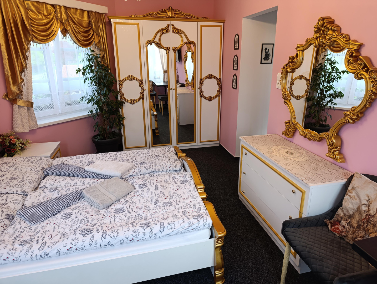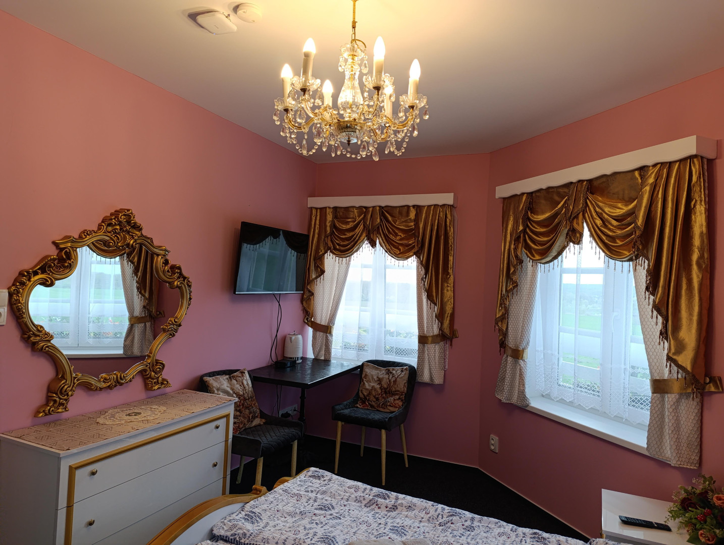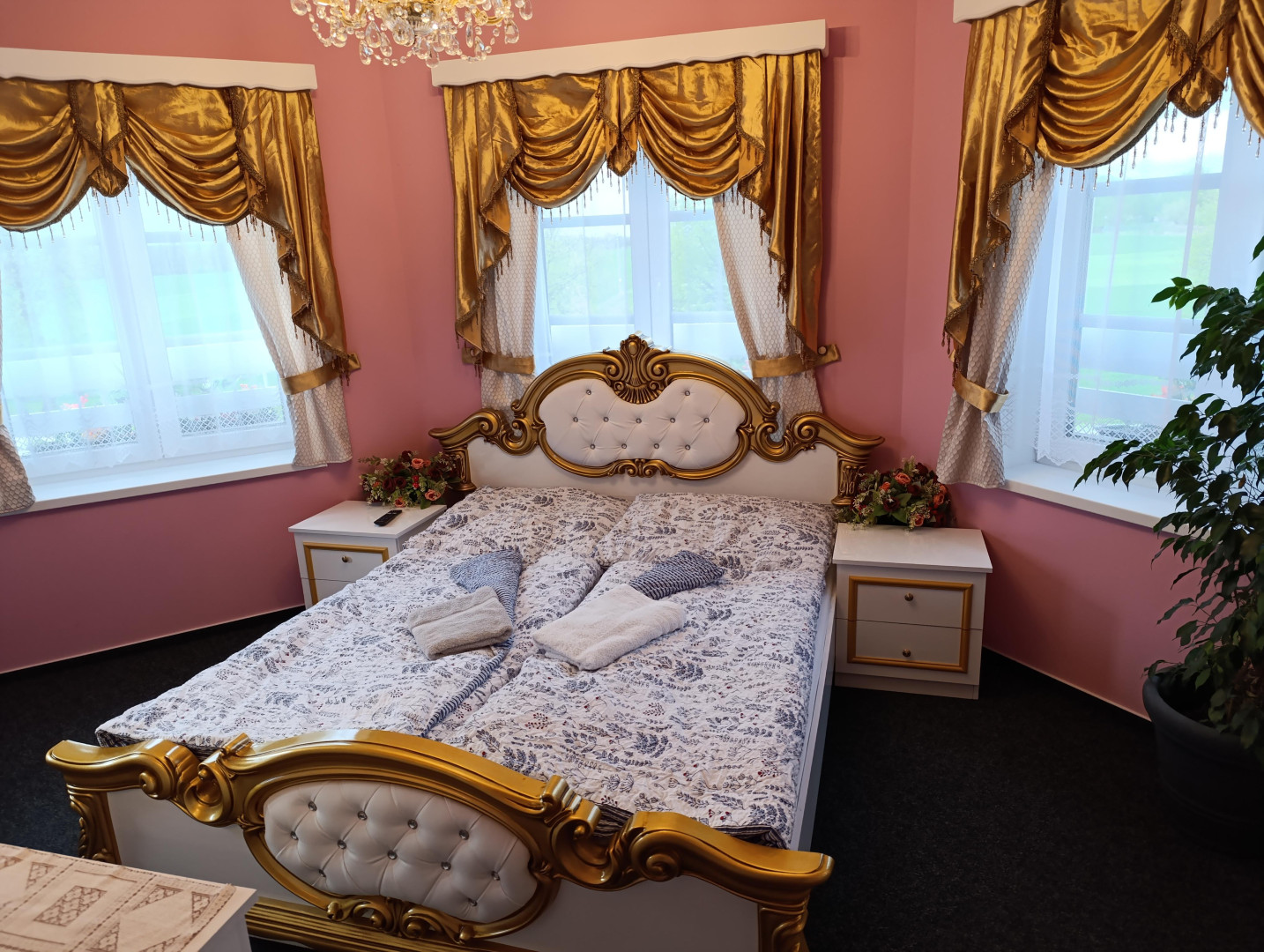 Pokoj č. 203 je spíše pro pár manželský či partnerský. V současné době je nejvíce laděn do zámkového stylu. V pokoji je útulná malá kuchyňka vybavená základními spotřebiči jako jsou rychlovarná konvice, mikrovlnná trouba, plotýnkový vařič. Najdete zde krásnou manželskou postel a útulnou koupelnu s romanticky osvětlenou vanou