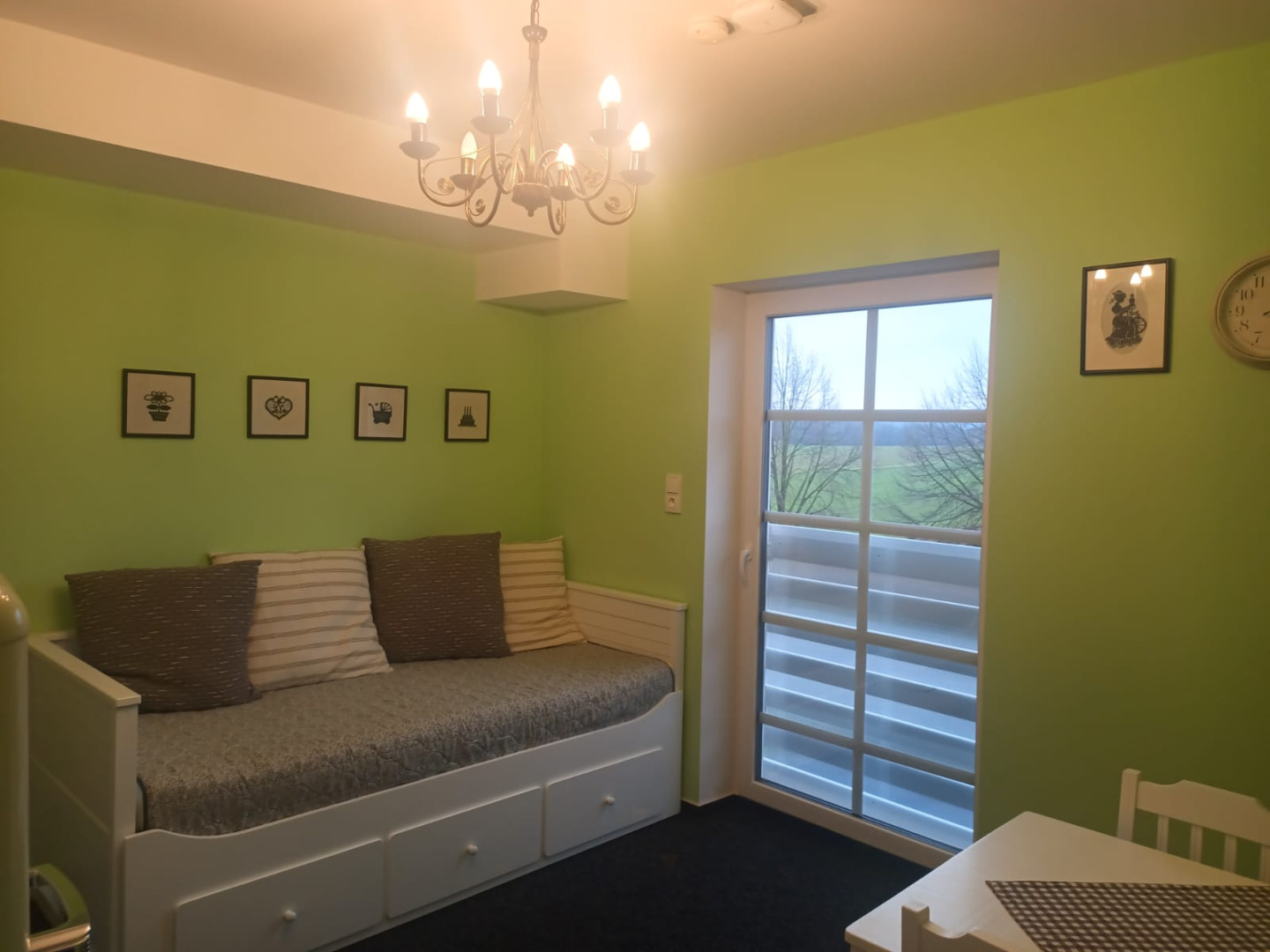 Apartmán č.205 je s kuchyňským koutem a menší ložnicí . Oba pokoje mají výhled z balkonu.