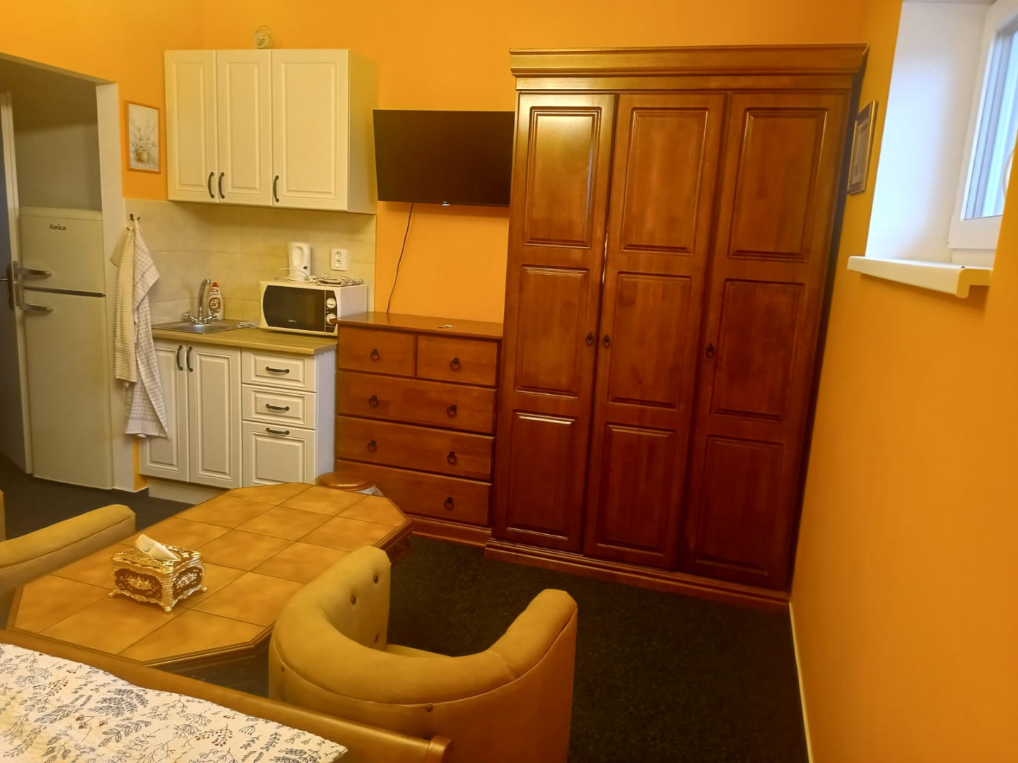 Pokoj č.209 je typický pro pár, který ocení útulnost malého pokoje ve tvaru čtverce. Je zde útulná malá kuchyňka a dobová obýváková stěna.